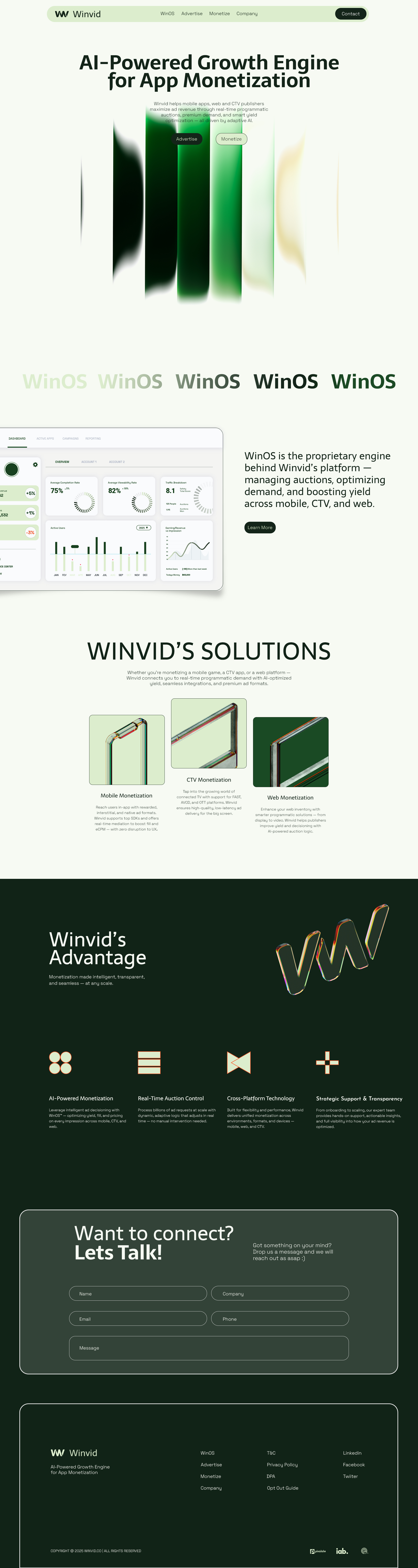 Our studio was invited to partner with Winvid, an emerging leader in AI-driven monetization, with the challenge of shaping a new identity that matched the ambition of their platform. The project encompassed a rebrand, from a redesigned logo to a fully reimagined digital presence, along with creative direction that would unify the brand across all touchpoints. We set out to create a bold and forward-looking identity that reflects Winvid’s innovative role within the fast-changing landscape of digital media.The process began with a close study of the company’s values, audience, and competitive environment. By understanding how Winvid empowers creators and advertisers, we were able to craft a visual language that reinforced both trust and progress. The refreshed logo was designed as a distilled emblem of precision and adaptability, while the website was rebuilt to deliver clarity, impact, and an intuitive user experience.Beyond design, our work centered on telling a coherent story — one that presents Winvid as a dynamic, confident, and future-ready brand. Each decision, from typography and color to the structure of the site, was rooted in that narrative. The outcome is a renewed identity that positions Winvid as a recognizable force in its industry, communicating innovation with clarity and leaving a lasting impression on its partners and users alike.
